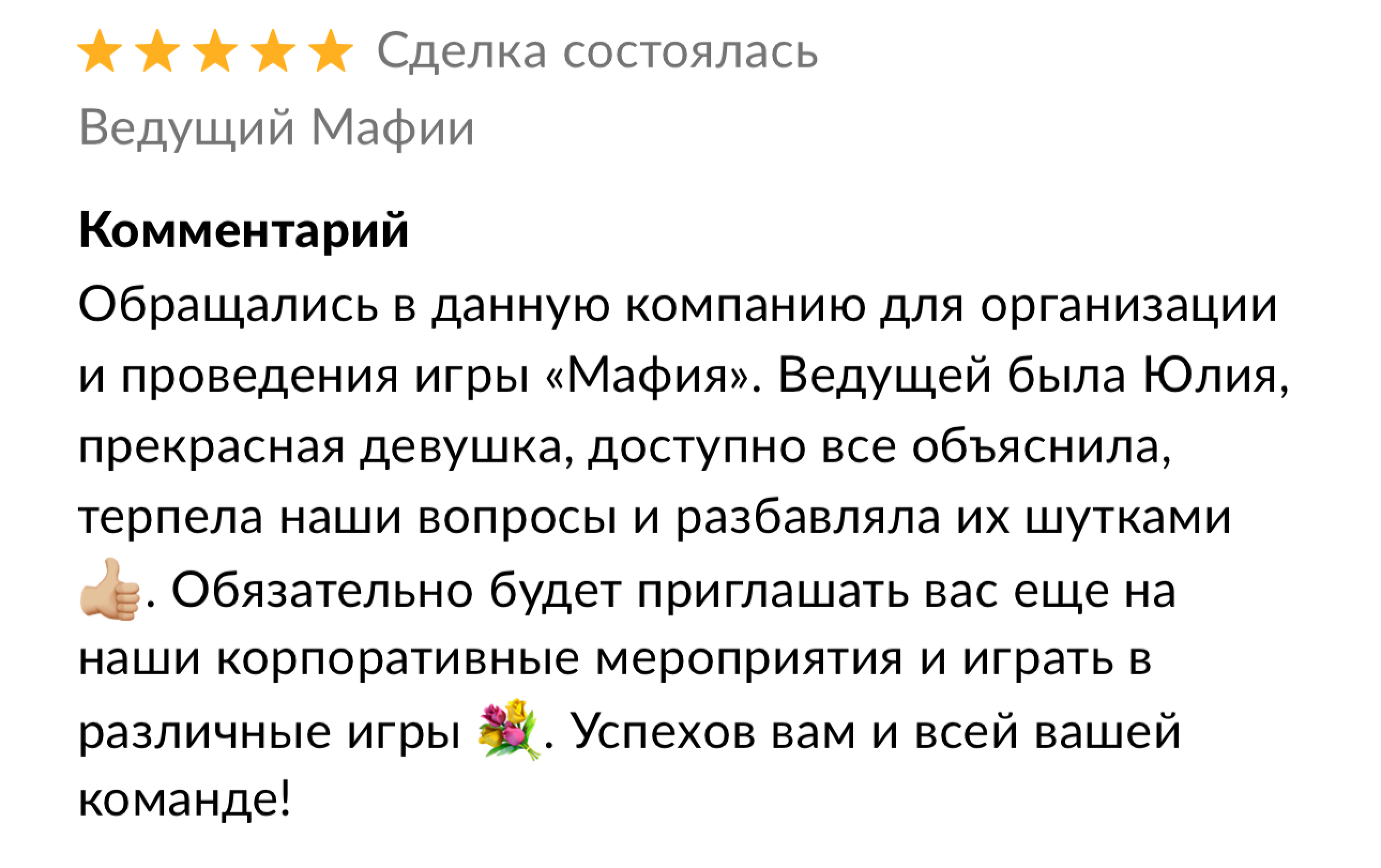 Это команда профессионалов, которая круто зарекомендовала себя в сфере ведущих таких игр как Мафия, Бункер, Суперкрокидил и множества других настольных игр.